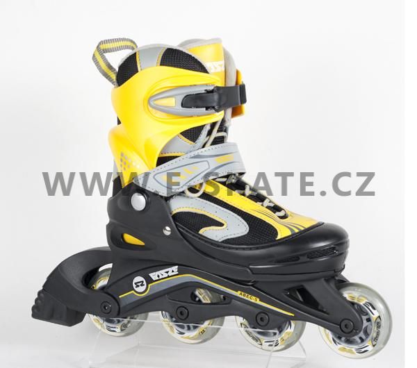 Možnost nastavení velikosti boty. Vnitří botička je přizpůsobena tvarem dětské noze. Pojistka na spodní straně boty umožnuje po jejím uvolnění správné nastavení velikosti nohy.